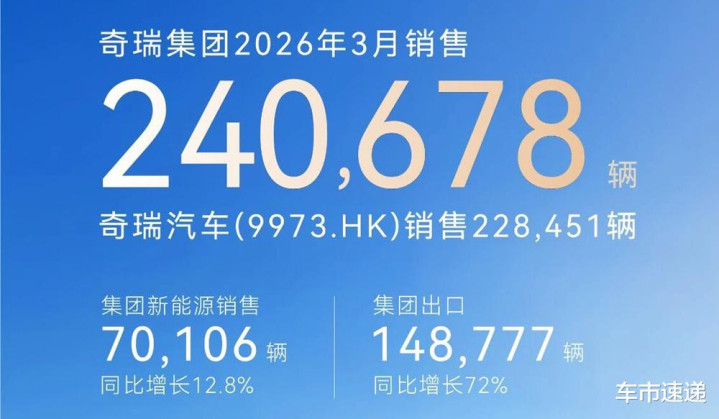 根据奇瑞公开的销量快报显示,2026年一季度集团累计销量601712台,集团3月销量超过24万台,其中,奇瑞汽车月销228451台。在刚刚过去的3月份,奇瑞集团海外出口148777台,同比增长72%;集团新能源汽车月销70106台,同比增长12.8%。