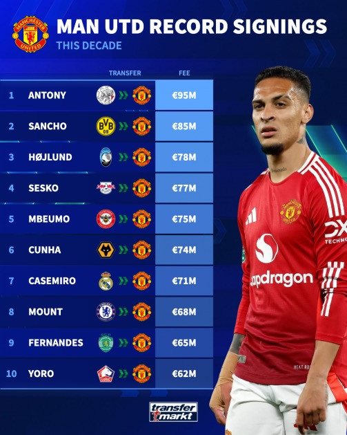 安东尼以9500万欧居首,桑乔和霍伊伦分别以8500万和7800万排名二三。
