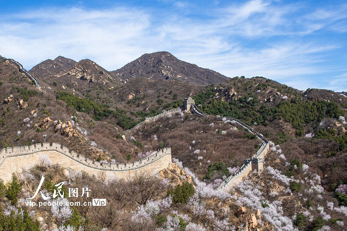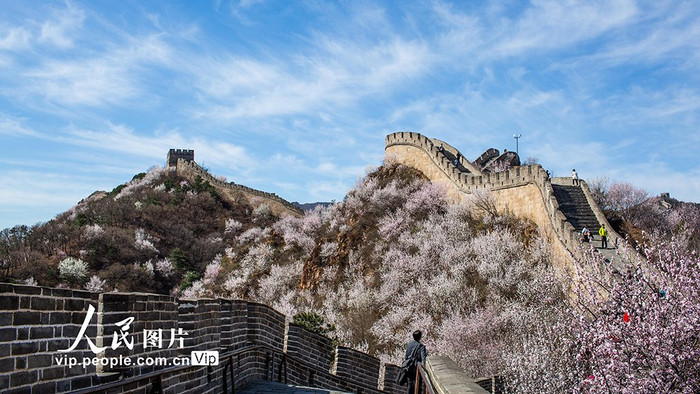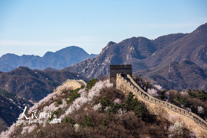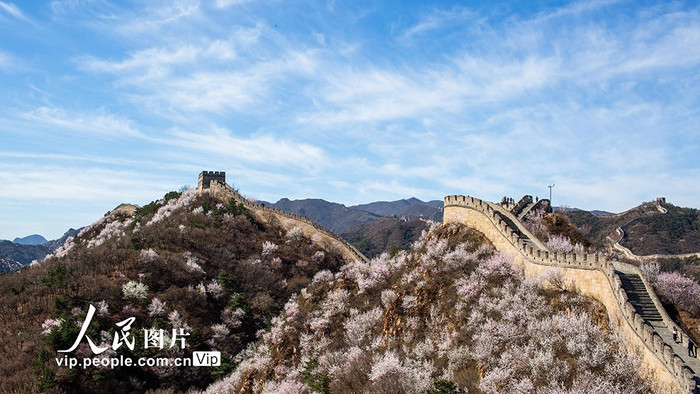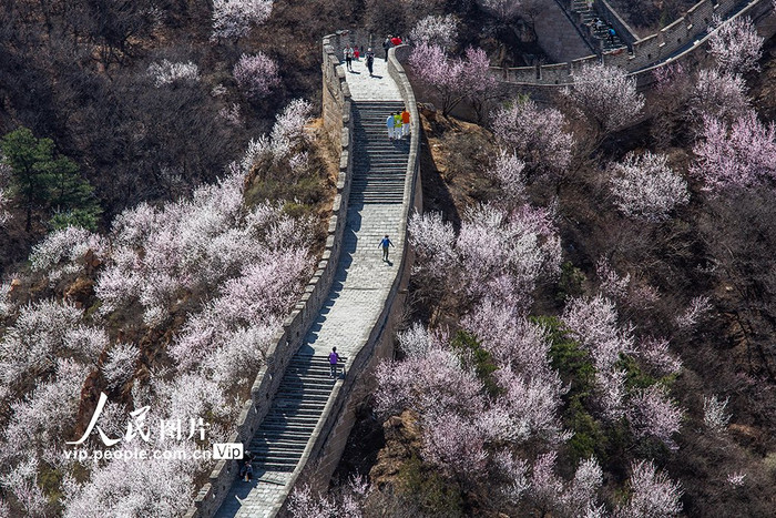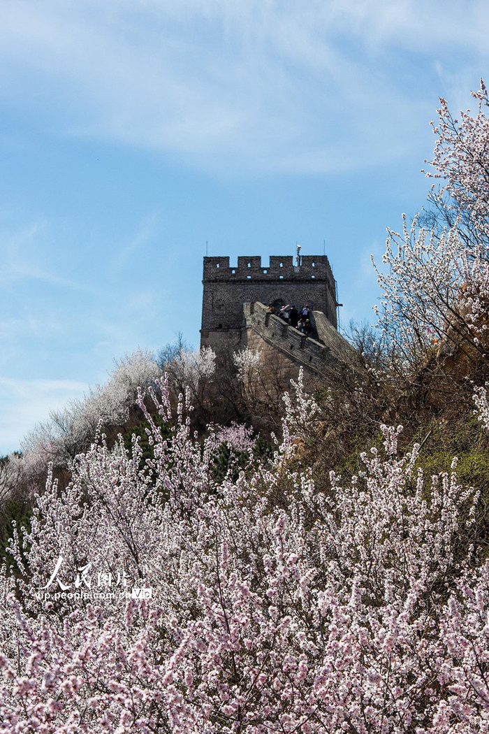 2026年4月1日,北京八达岭长城景区,山桃、杏花漫山绽放,绘出春日限定画卷。张立新摄(人民图片网)